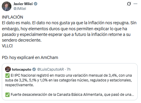 El Presidente de la Nación, Javier Milei, expresó públicamente su disconformidad con los niveles actuales de inflación. Sin embargo, desde el Gobierno confirmaron que no se realizarán cambios en el rumbo de la política económica establecida.